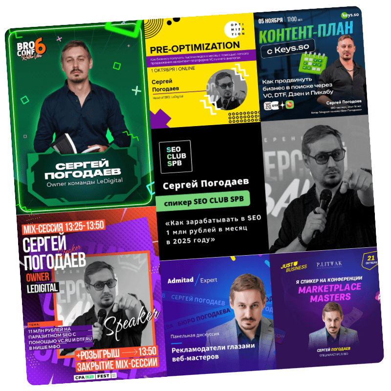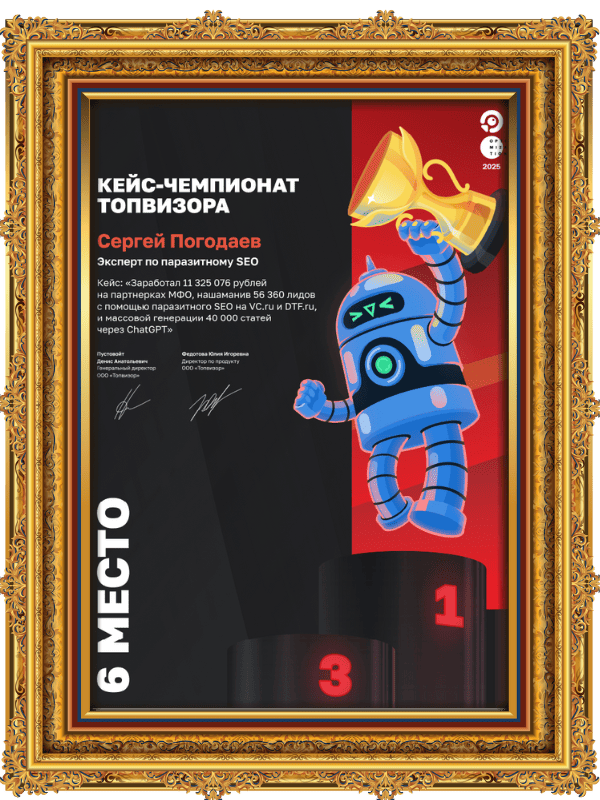 В 2025 году я занял 6 место в авторитетном конкурсе SEO-специалистов от сервиса Топвизор. Так что, на вашей сцене будет выступать эксперт, входящий в ТОП-10 SEO-специалистов России
